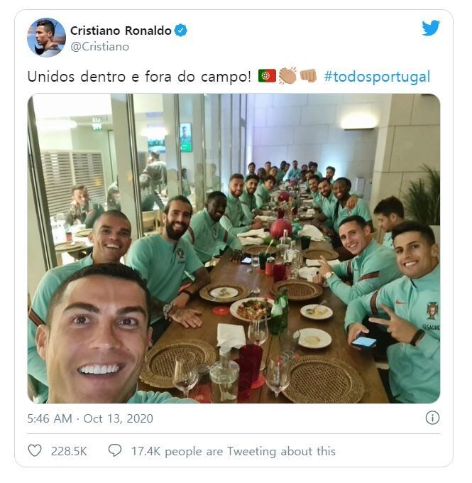 호날두는 지난 12일 프랑스와의 경기 이후, 동료들과 함께 식사하고 있는 모습을 담은 사진을 트위터에 올린 바 있다.