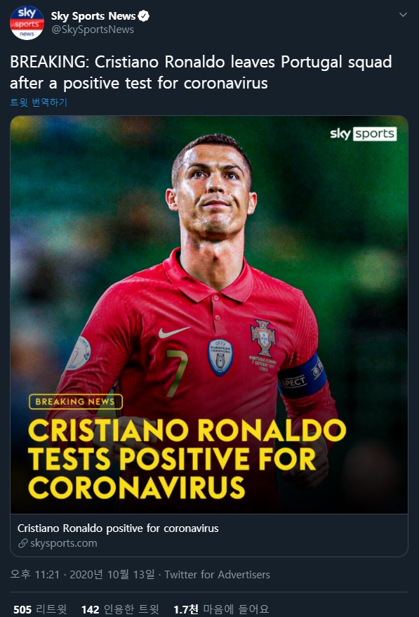 포르투갈축구협회는 13일(현지시각) 호날두가 코로나19 양성판정을 보였다며